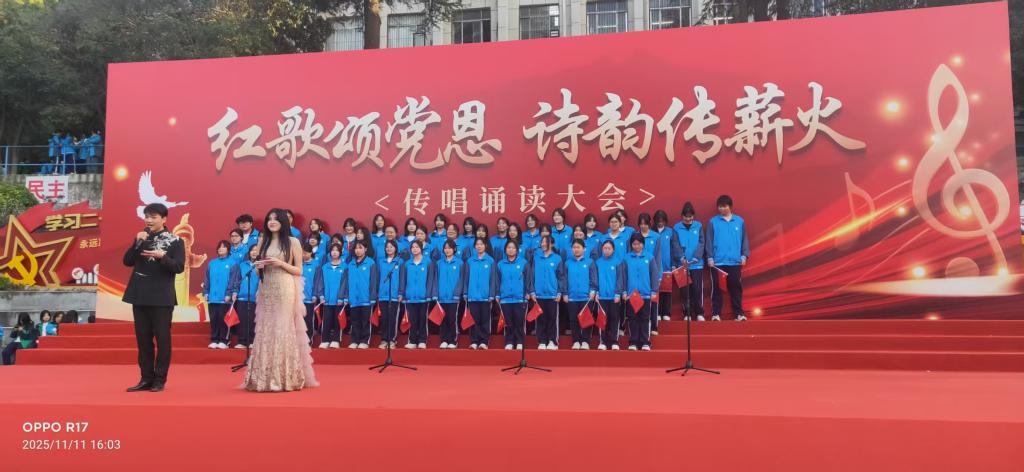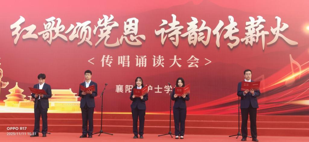 2025年11月11日下午,襄阳市护士学校在学校党委的坚强领导与校团委的精心组织下,成功举办“红歌颂党恩 诗韵传薪火”传唱诵读活动。本次活动以红色文化为核心主题,通过歌曲演唱与诗歌朗诵相结合的形式,生动展现了全校师生对党的赤诚情怀与对祖国的无限热爱。