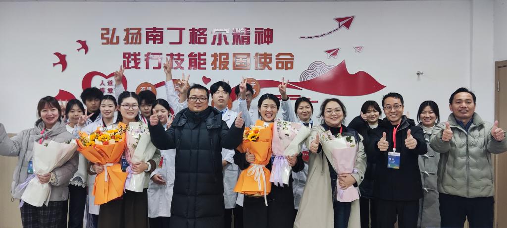 校长杨义耀手捧鲜花欢迎竞赛团队载誉归来,他指出:“此次成绩的取得,是我校持续深化教学改革、注重实践能力培养的阶段性成果。学校将依托竞赛平台,进一步完善‘教、学、练、赛’一体化育人机制,推动课程内容与行业标准深度对接,全面提升人才培养质量,为服务健康中国战略和地方医疗卫生事业输送更多优秀专业人才。”