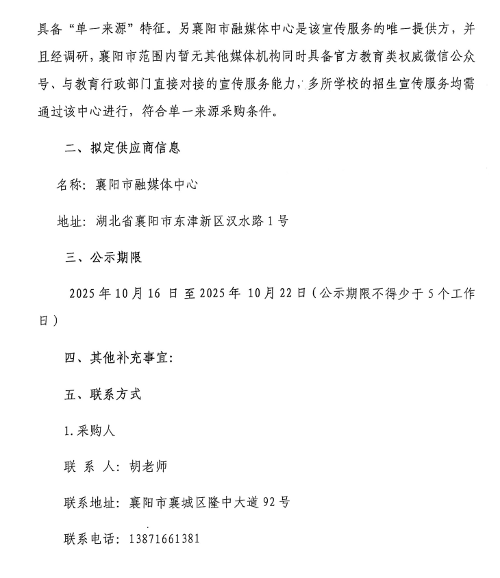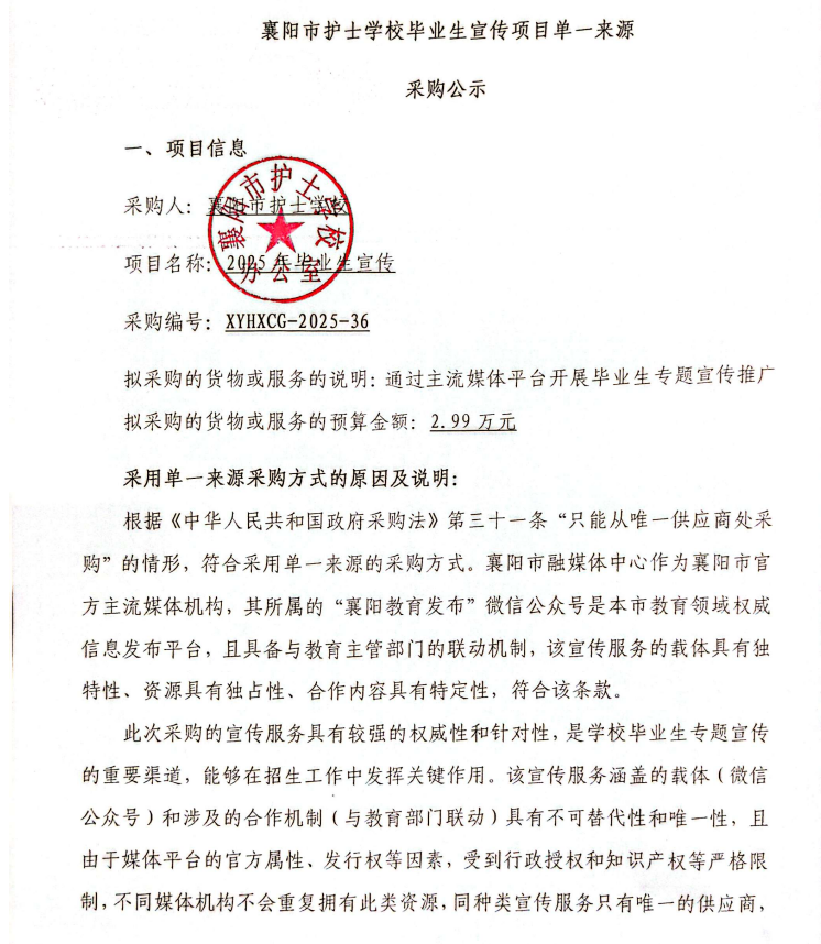 襄阳市护士学校毕业生宣传项目单一来源采购公示