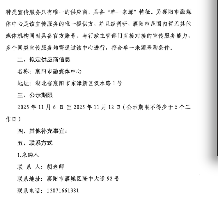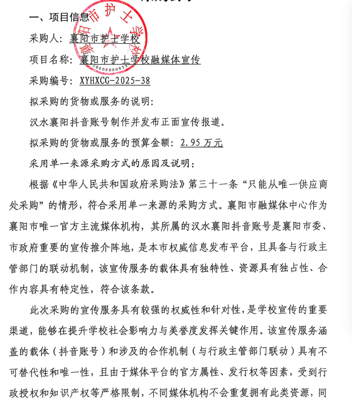 襄阳市护士学校融媒体宣传项目单一来源采购公示