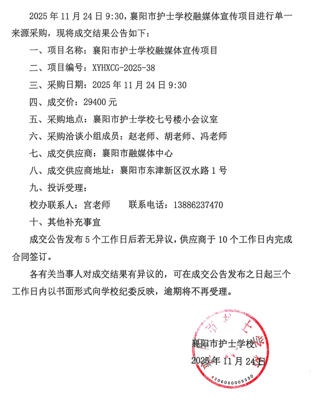 襄阳市护士学校融媒体宣传项目单一来源采购结果公告