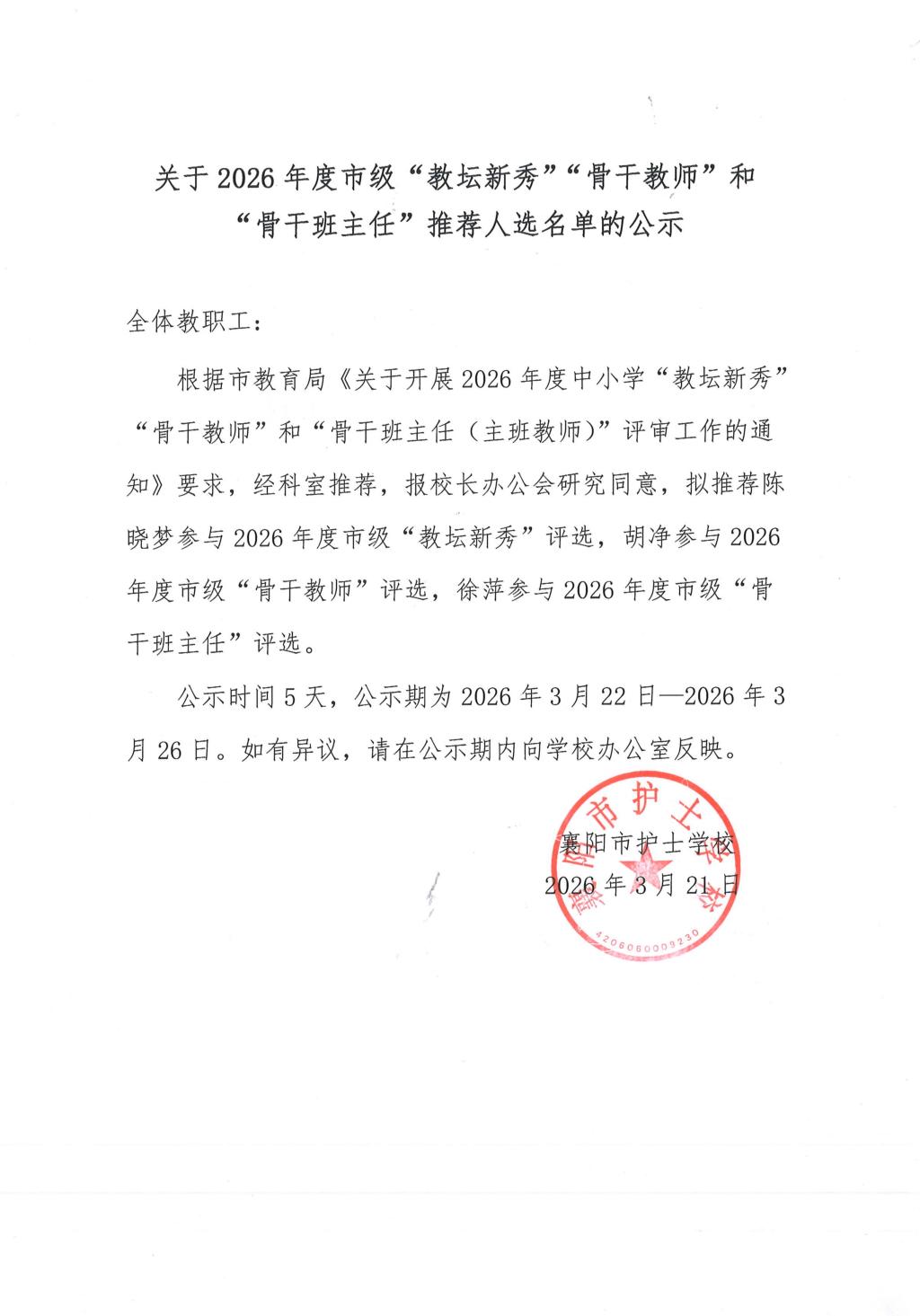 关于2026年度市级“教坛新秀”“骨干教师”和“骨干班主任”推荐人选名单的公示